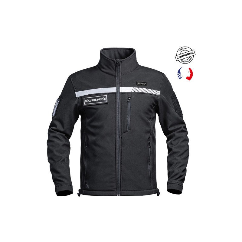 Softshell SECURITÉ PRIVÉE,Identifiants escamotables, conforme nouveau decret, emplacement RIO et marquage dos rétro.